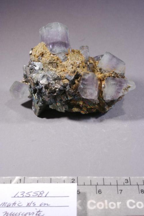 Descriptiongroup of color-zoned (purple in center, colorless at ends) prismatic crystal on arsenopyrite with tan muscovite xls